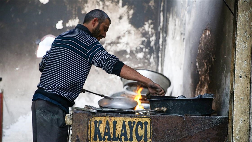 Tarihi çarşıda, toz nişadır (amonyum klorür) yardımıyla kendisine getirilen bakır kapları kalaylayan Okan, dede mesleğini yaşatmaya çalışıyor.