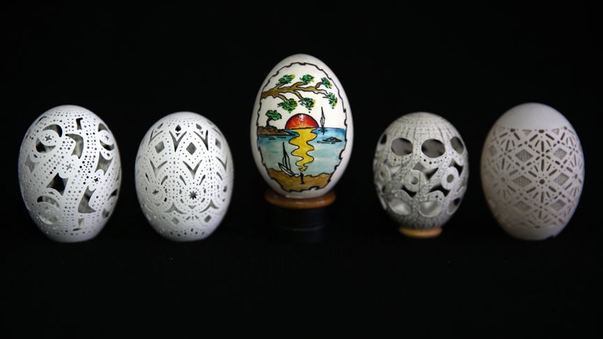 Yumurtanın bir kaideye oturması ve oyulması içini boşalttığını anlatan Eroğlu, bir hafta devam eden oyma sonrası daha fazla zevk almak için zor olanı seçip uygun gördüğü eserlerin içine cımbız kullanarak tela yerleştirdiğini aktardı.