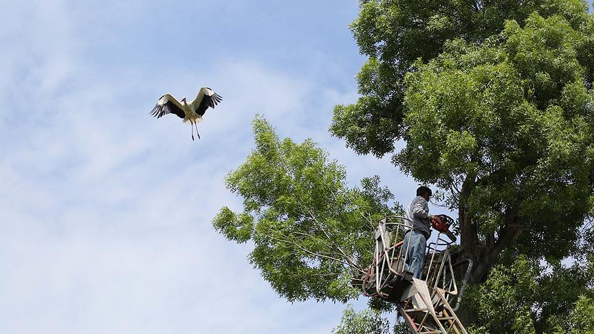 Samsun'un 19 Mayıs ilçesi Dereköy Mahallesi sakinleri, leyleklerin, ağaçtaki yuvaya girişini zorlaştıran dalları motorlu testereyle kesti.